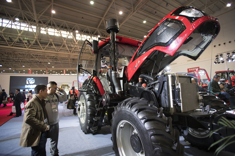 10月26日,參觀者在參觀中聯(lián)重科公司生產(chǎn)的PL2304輪式拖拉機(jī)。