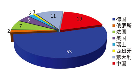 德國作為世界大型商展的主導(dǎo)力量至今無人能撼,但發(fā)展速度略低,在2013年世界商展100大排行榜中,德國展覽超過半數(shù),達到53席。中國比上年再增1席,從18席增加到19席,為鞏固中國在世界展覽中第2大陣營的地位又添一磚。美國也從危機中復(fù)蘇,在100大榜中從4席增加到5席。榜單中其他國家均保持了自己的地位:法國8席、俄羅斯2席,瑞士2席、西班牙1席,見圖1