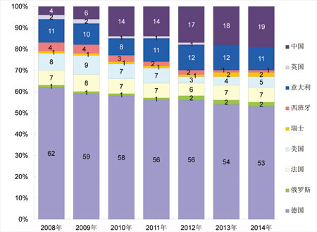通過新榜單我們不難發(fā)現(xiàn),各展覽大國仍堅守著各自的份額。榜單變化不大,相對增長緩慢,中國展覽份額正穩(wěn)步上升,2008年中國在100大排行榜中僅占4席,到2014年達到19席,成為世界商展的主要舉辦國。面對這樣的局面,德國展覽公司并不著急,德國的同行早已先行一步,開啟了全球辦展的步伐,并取得了積極成就,在中國的大型展覽中,有一部分正是德國展覽在中國的子展,見圖3。