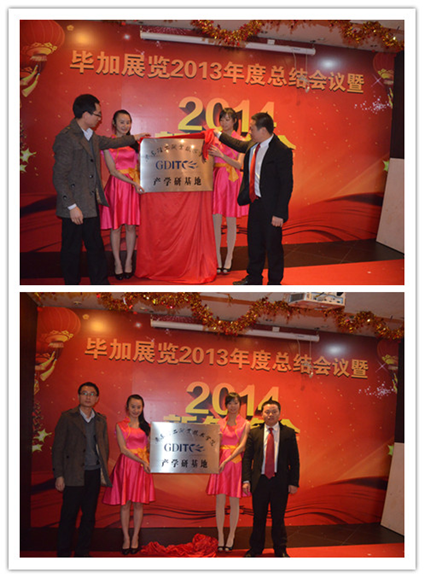 在畢加展覽2013年度總結(jié)會議結(jié)束后,畢加展覽2014新年晚會正式開始。首先,進(jìn)行了畢加展覽成為廣東輕工職業(yè)技術(shù)學(xué)院產(chǎn)學(xué)研基地的揭牌儀式,這象征著畢加人才隊伍建設(shè)邁上了一個新的臺階。