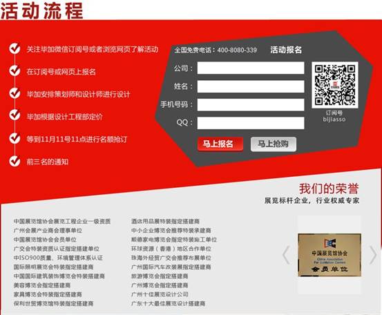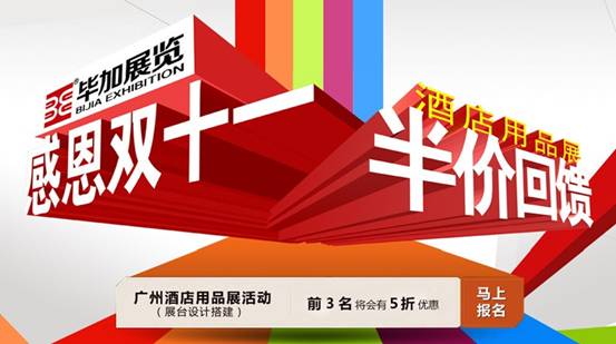 十一月是感恩的日子,為了回饋廣大新老客戶對(duì)我司的支持和厚愛,畢加展覽特推出酒店用品展展臺(tái)半價(jià)回饋客戶活動(dòng)。只要您現(xiàn)在報(bào)名聯(lián)系我們,并在11月11日11時(shí)開始的活動(dòng)中搶到前3位簽訂合同名額,您就可以獲得展臺(tái)半價(jià)的優(yōu)惠。