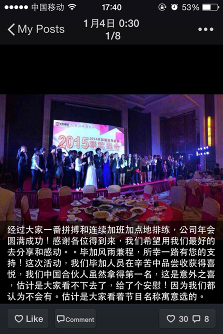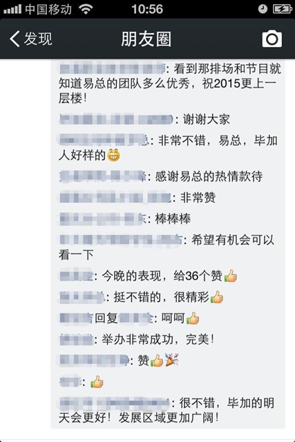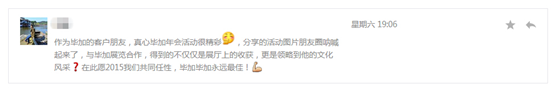 2014畢加展覽年會暨2015聯(lián)歡晚會雖然結(jié)束了,但是朋友圈依然熱火朝天,院校、供應商、工廠等朋友們都給了畢加“10086”個贊,紛紛給畢加人發(fā)來賀電,給畢加公司送來祝福。畢加人在年會上精彩的表現(xiàn)讓人眼前一亮,作為一家展覽行業(yè)的標桿企業(yè),來年的我們一定會以實際行動履行我們的承諾,給予客戶更好的設計與服務。這次年會,在畢加角度上講,這就像一個強力馬達,不斷驅(qū)動著我們往目標前進。柏拉圖說:漫無目的的生活就像出海航行而沒有指南針。航海沒有指南針,就是一艘船在海上航行,沒方向,那有可能遇上大風浪,暴雨,暗礁,隨時沉沒死亡。一條條的評價聚集在一起,讓畢加展覽這艘豪輪有了一個風向標,始終瞧著目標前進。
