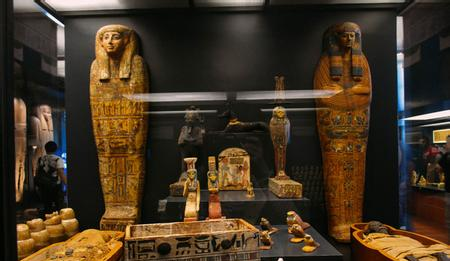一邊是有著3000多年歷史的古埃及年輕女性木乃伊和人形蓋板,一邊是約有2100年歷史的中國漢墓金縷玉衣和玉棺,展廳內(nèi)光線黯淡,紗幔輕墜,充滿神秘氛圍。